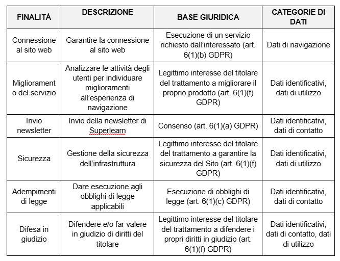 Qualora Lei si iscriva alla newsletter di Superlearn, le verranno inviati contenuti a scopo promozionale, riguardanti le iniziative e le attività svolte dalla società, inviti agli eventi, nonché offerte promozionali. Il trattamento è svolto esclusivamente previa acquisizione del Suo consenso, ai sensi dell’art. 6(1)(a) del GDPR.