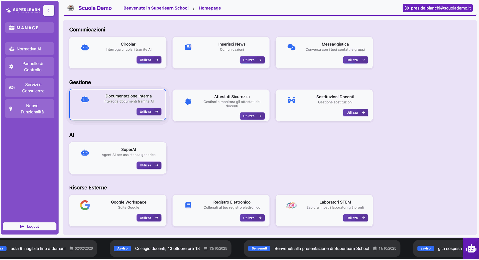Nel modulo Manage, il personale amministrativo trova tutto ciò che serve per governare la scuola in modo efficiente. Ti permette di gestire tutto da un’unica dashboard: documenti, circolari, attestati, la gestione delle sostituzioni, la pubblicazione di news interne e un pannello di controllo che consente di configurare ogni aspetto della piattaforma.